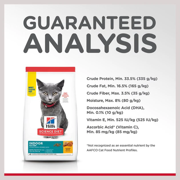 Hill’s Science Diet Kitten Indoor Dry Cat Food provides your four-legged friend with great tasting nutrition for a long, happy life. Made with wholesome ingredients such as savory chicken, this nourishing recipe is balanced to meet your pet’s needs, and promote healthy, gentle digestion. Manufactured in the United States, every ingredient meets strict requirements for purity and nutrient content which exceed industry standards. Formulated for kittens from weaning until 1 year old and cats who are pregnant or nursing, this Hill’s Science Diet provides your cat the nutrition she needs for a lifetime of health and happiness.