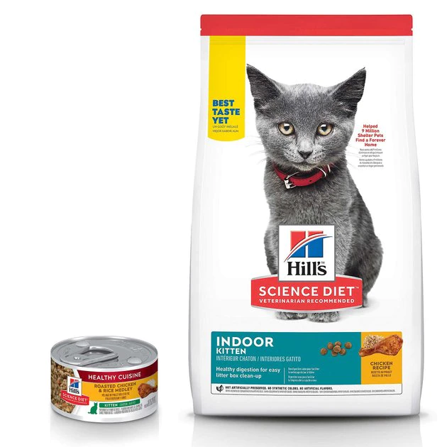 - Comes with Hill’s Science Diet Kitten Healthy Cuisine Roasted Chicken & Rice Medley Canned Cat Food and Hill’s Science Diet Kitten Indoor Dry Cat Food.