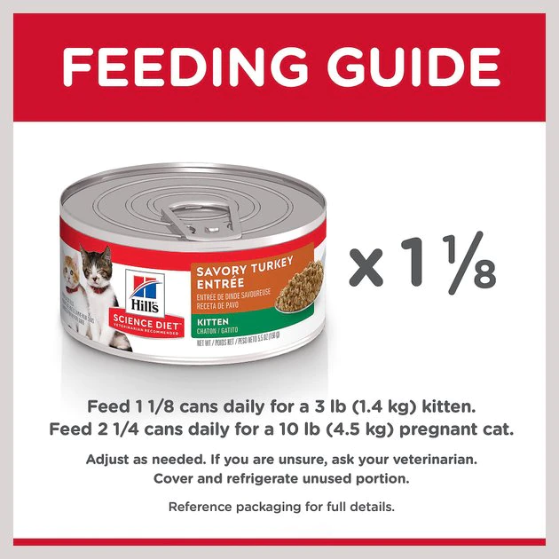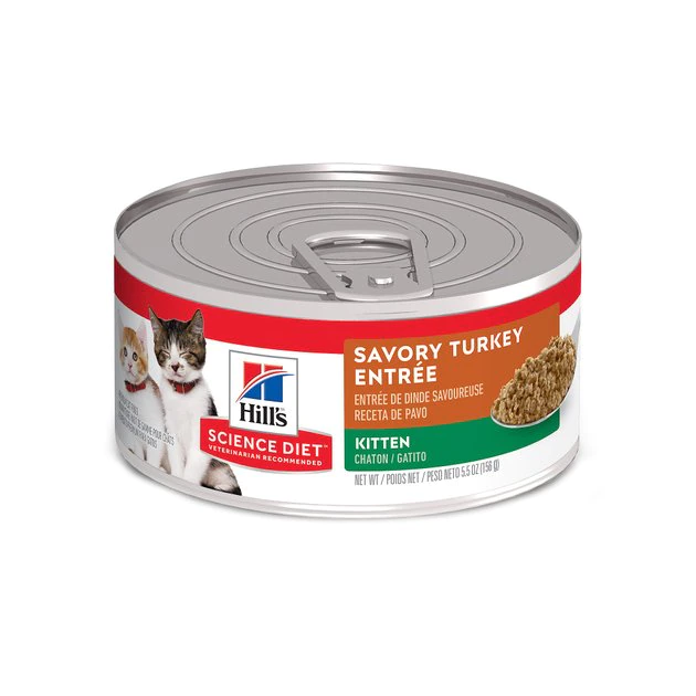 Hill’s Science Diet Kitten Savory Turkey Entree Canned Cat Food provides your four-legged friend with great tasting nutrition for a long, happy life. Made with wholesome ingredients such as savory turkey, this nourishing recipe contains high quality lean protein to maintain an ideal body weight and promote healthy digestion. Manufactured in the United States, every ingredient meets strict requirements for purity and nutrient content which exceed industry standards. Formulated for kittens under 1 year of age, this Hill’s Science Diet provides your cat the nutrition she needs for a lifetime of health and happiness.