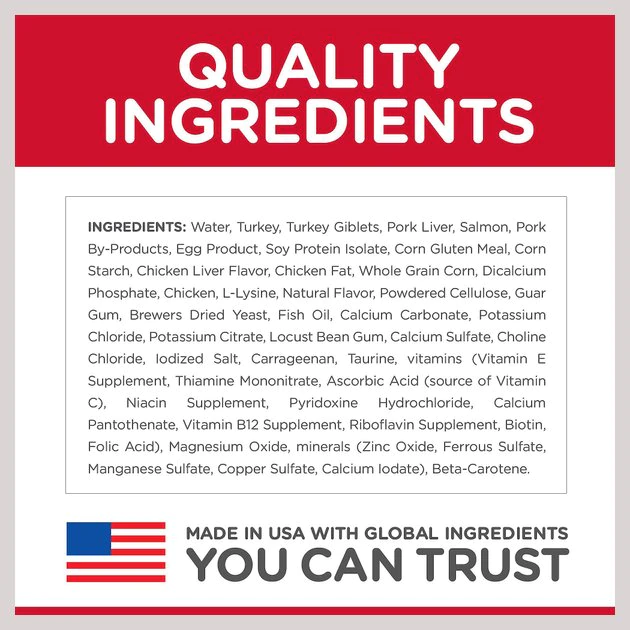 Water, Turkey, Turkey Giblets, Pork Liver, Salmon, Pork By-Products, Egg Product, Soy Protein Isolate, Corn Gluten Meal, Corn Starch, Chicken Liver Flavor, Chicken Fat, Whole Grain Corn, Dicalcium Phosphate, Chicken, L-Lysine, Natural Flavor, Powdered Cellulose, Guar Gum, Brewers Dried Yeast, Fish Oil, Calcium Carbonate, Potassium Chloride, Potassium Citrate, Locust Bean Gum, Calcium Sulfate, Choline Chloride, Iodized Salt, Carrageenan, Taurine, vitamins (Vitamin E Supplement, Thiamine Mononitrate, Ascorbic Acid (source of Vitamin C), Niacin Supplement, Pyridoxine Hydrochloride, Calcium Pantothenate, Vitamin B12 Supplement, Riboflavin Supplement, Biotin, Folic Acid), Magnesium Oxide, minerals (Zinc Oxide, Ferrous Sulfate, Manganese Sulfate, Copper Sulfate, Calcium Iodate), Beta-Carotene.