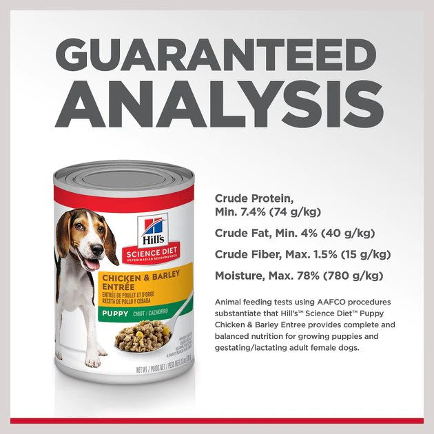 Hill’s Science Diet Puppy Chicken & Barley Entree Canned Dog Food has a great taste and precisely balanced nutrition to help build immunity and mobility. Superior nutrition from high-quality ingredients enhances better overall health. This delicious formula promotes gentle and healthy digestion and has a savory meaty taste your puppy will love!