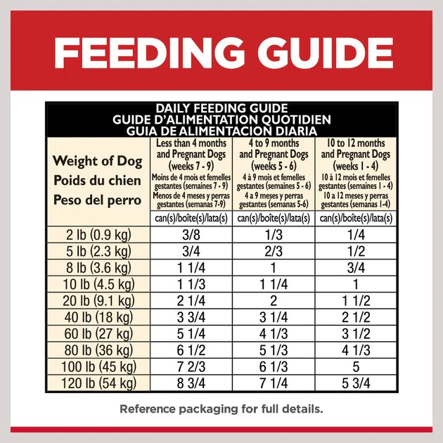 | Weight of Dog | Up to 4 Months and Pregnant week 7 – 9 (cups) | 4 to 9 Months and Pregnant week 5 – 6 (cans) | 10 to 12 Months and Pregnant week 1 – 4 (cans) |