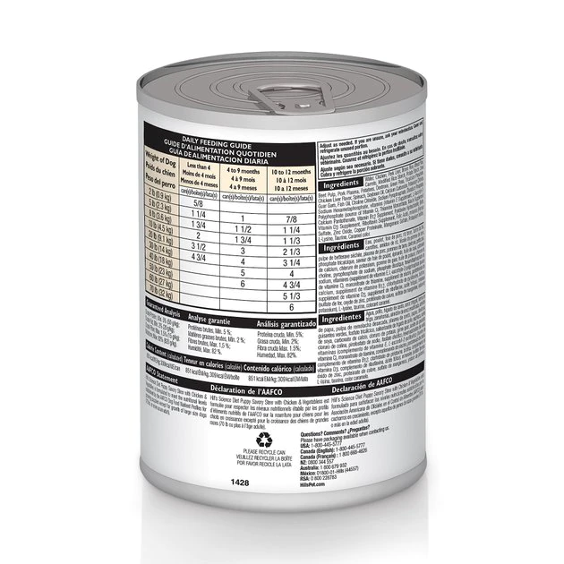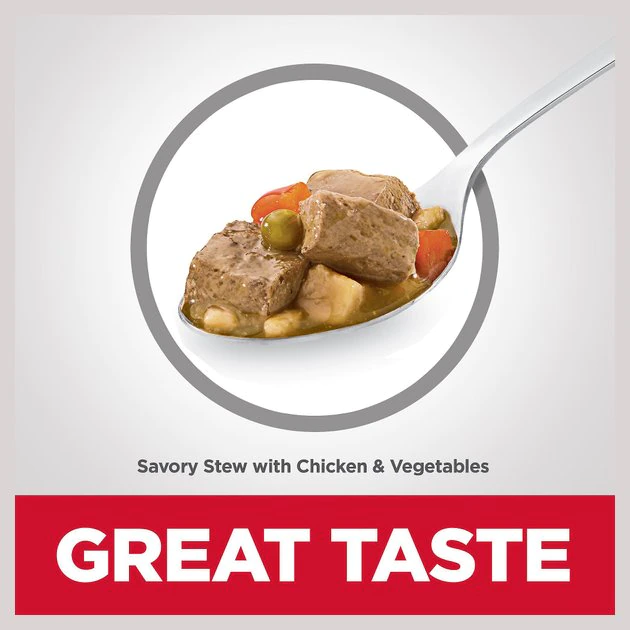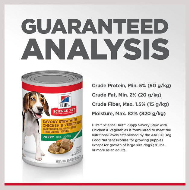 Hill’s Science Diet Puppy Savory Stew with Chicken & Vegetables is a delicious way to provide precisely balanced nutrition that enhances the overall health and well-being of your puppy. It is made with real chicken, brown rice and a medley of delectable vegetables including peas and carrots, all smothered in a delicious gravy.