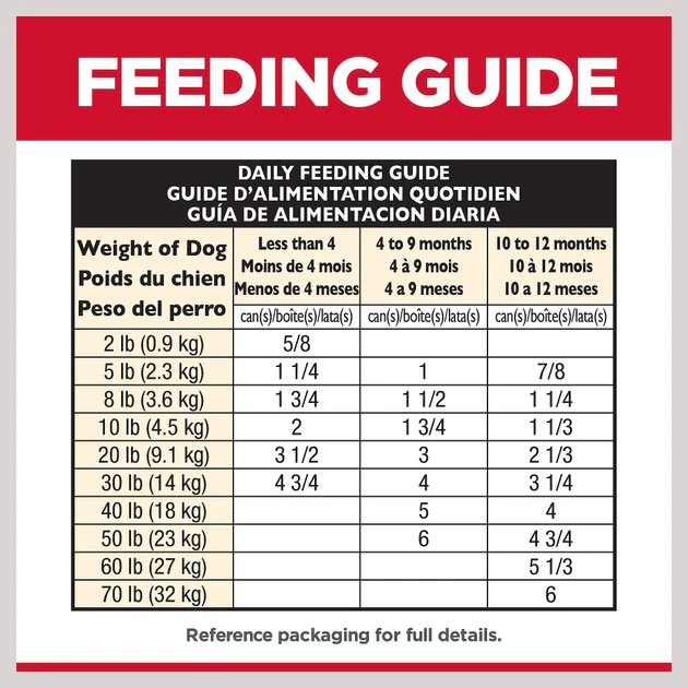 Cover and refrigerate unused portion. Adjust feeding amounts as necessary to maintain optimal weight. If you are unsure, ask your veterinarian. For nursing dogs: keep food available at all times. New to this food? Mix increasing amounts of your pets new food with decreasing amounts of the old food over a 7 – day period. Keep fresh water available at all times! Your pets nutritional needs may change as they age. Ask your vet at every checkup. Science Diet is available in a wide variety of dry foods, canned foods and treats for your pets unique needs.