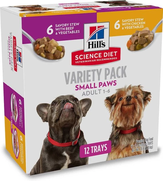 - Wet dog food variety pack contains six trays each of Small Paws Chicken & Vegetables and Small Paws Beef & Vegetables.