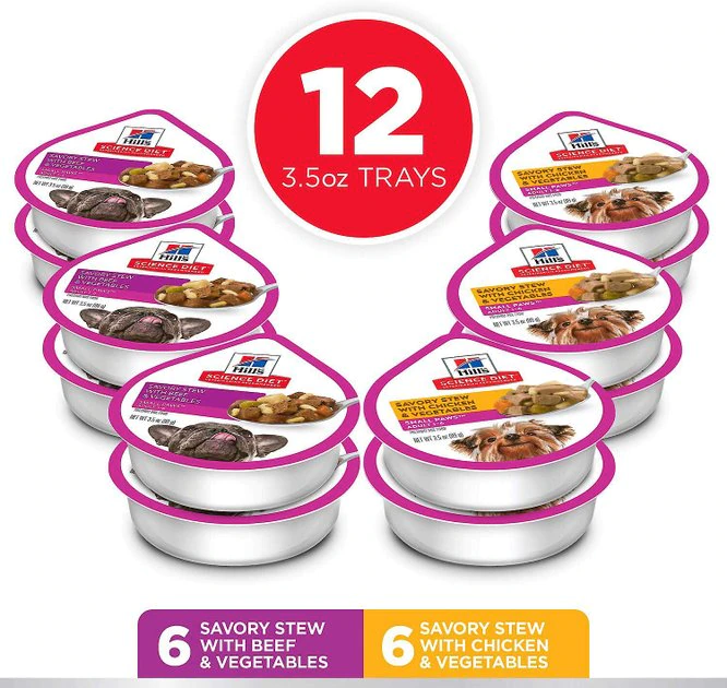 Serve up some goodness with Hill’s Science Diet Small Paws Chicken & Vegetables & Beef & Vegetables Variety Pack Wet Food Trays + Small & Mini Perfect Weight Dry Dog Food! Then help them stay their ideal weight with Hill’s Science Diet Adult Perfect Weight Small & Mini Chicken Recipe Dry Dog Food! These convenient single-serving tubs are the perfect way to provide your little pup with a delicious, well-balanced meal. Made with high-quality lean protein to help maintain ideal body conditions, this tasty meal is the perfect way to keep your best friend in tip-top shape. Then spoil your pup with a unique recipe that helps keep them trim all your long. This yummy dry dog food recipe is crafted with protein from real chicken, and it’s specifically designed for small and toy breed adult dogs who need to be mindful of their weight. It’s backed by decades of cutting-edge research, and your dog will love the way every bite tastes!