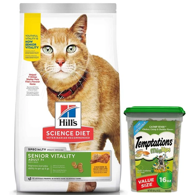 Help keep your cat feeling and acting young with Hill’s Science Diet 7+ Senior Vitality Chicken Recipe Dry Food + Temptations Mixups Catnip Fever Cat Treats. 7+ Senior Vitality is packed with all kinds of youth-preserving goodness, including powerful antioxidants for a healthy brain as well as nutrients that support activity and an interest in playing. After a good play session, reward her Temptations Mixups! These unique little pocket-shaped rewards have an irresistible crunchy outside and a soft and creamy inside with the purr-worthy flavor combination of chicken, catnip and cheese. Plus, they’re 100 percent nutritionally complete and balanced for adult cats and are just under 2 calories per piece—so you can feel good treating your senior sweetie to these purely exciting snacks!