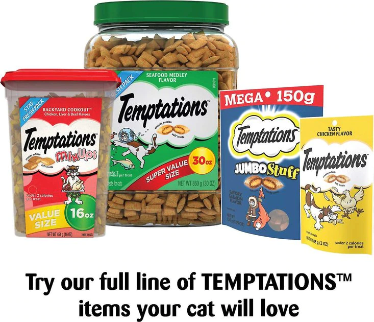 - Temptations are crafted with vitamins and taurine—an amino acid that helps support your cat’s overall health and well-being.